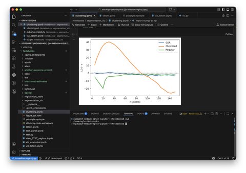 The figure below shows then end result of Visual Studio Code running on your desktop, connected to the remote server. It shows a remote Jupyter notebook opened for editing and running and a remote terminal to run commands.